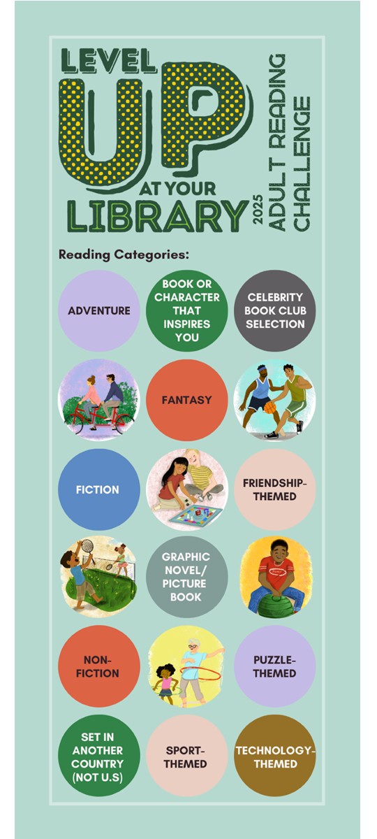 We challenge your reading life! During the 2025 calendar year, receive a prize drawing entry for reading one title from each of the twelve categories: